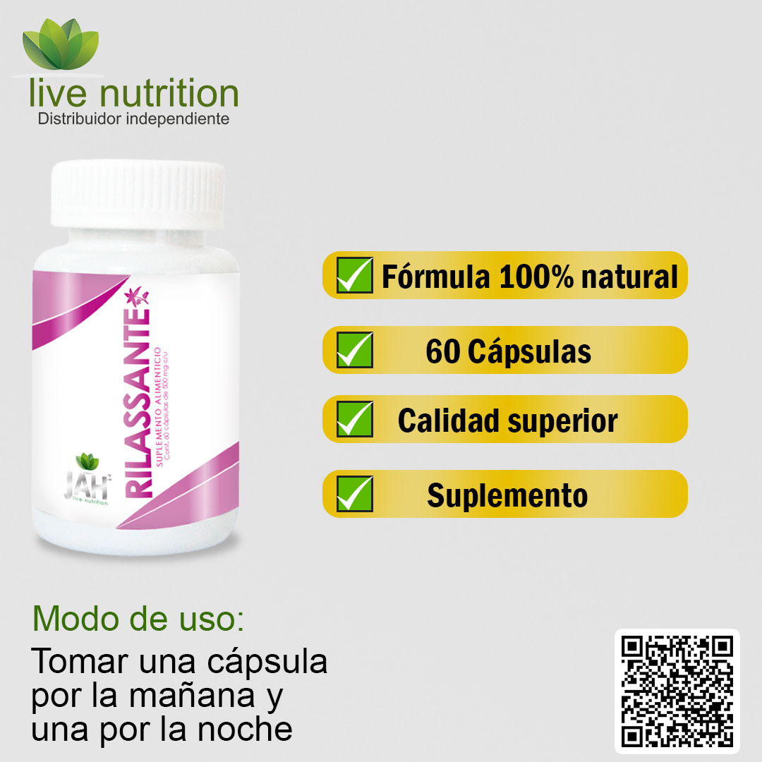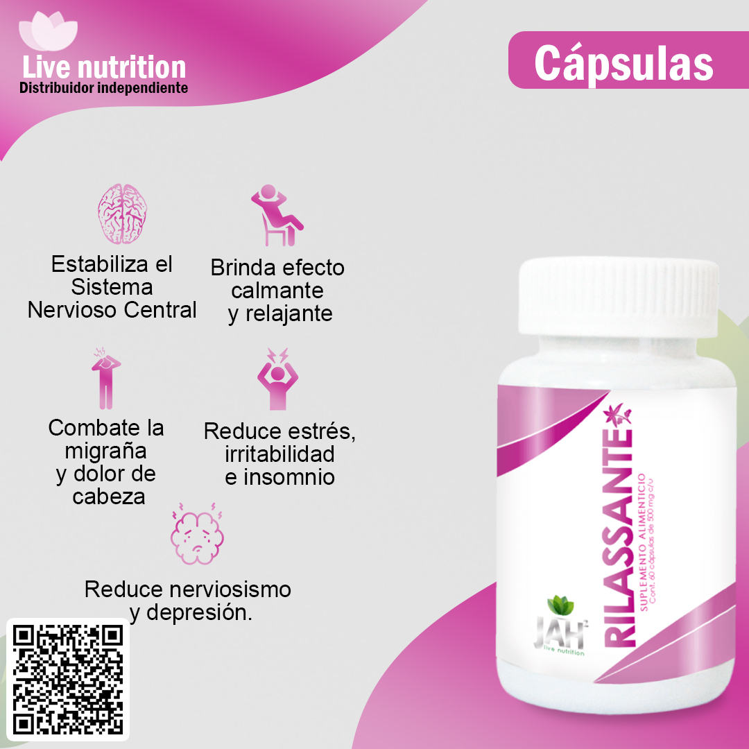 RILASSANTE CAPS hecho a base de extractos de distintas hierbas naturales con aporte tranquilizante, ansiolítico, relajante muscular y digestivo que ayuda a relajarse y minimizar el estrés causado por los problemas cotidianos.